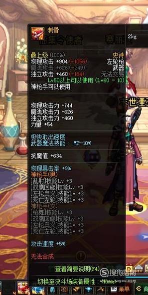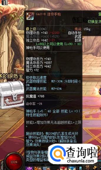 武器方面有两把武器可供选择,其一是60级SS左轮枪“刺骨”,其二是90级传说自动手枪“GAU-8 迷你手枪”,这两把武器都可以增加3级的【死亡左轮】技能等级,前者主要是通过兑换获得,需要耗费一定的时间,后者可直接在拍卖行进行购买。