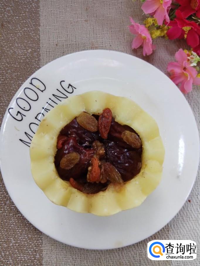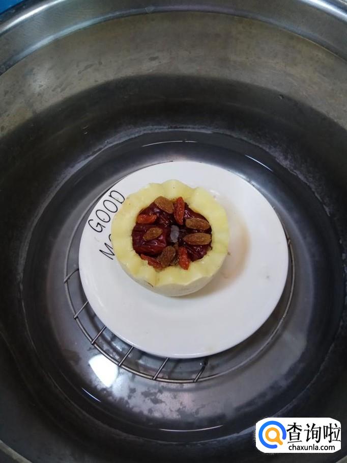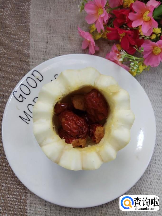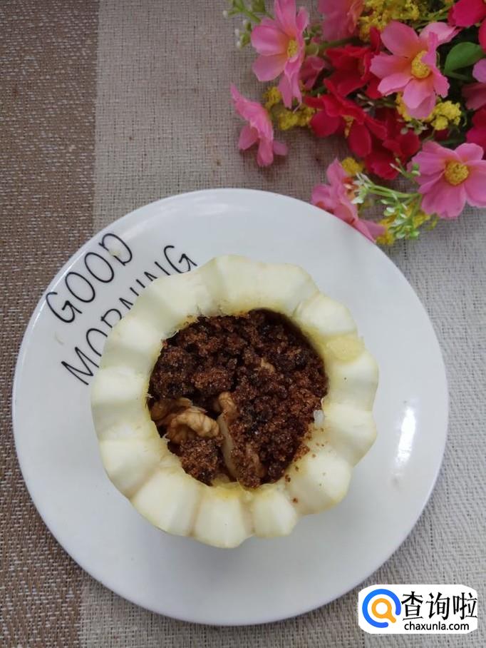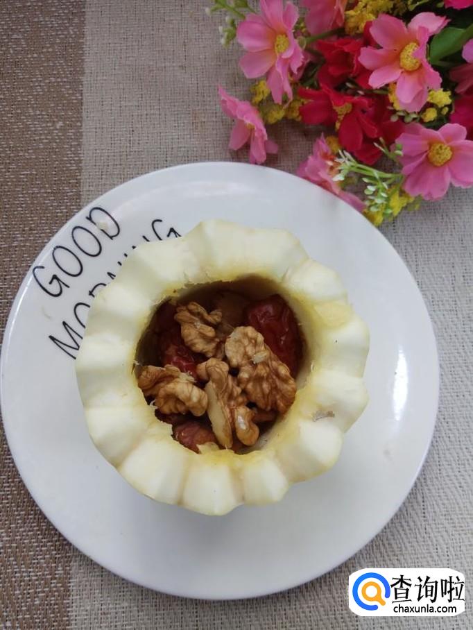 先将大枣放入笋瓜的中间,再将核桃仁也放进去。