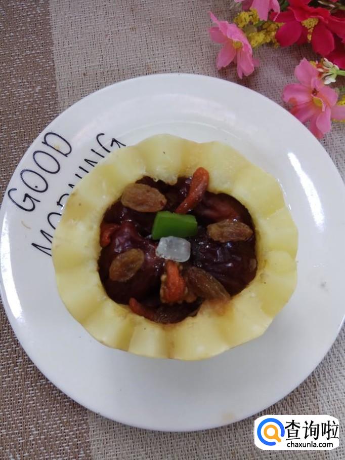 表面上撒上一层红糖,再用红糖和枸杞子摆出一个圈,中间再放上一个冰糖。