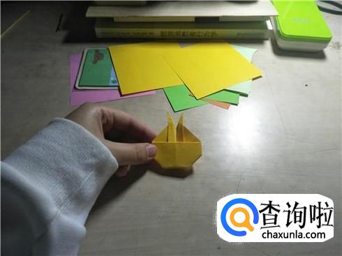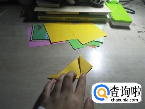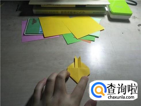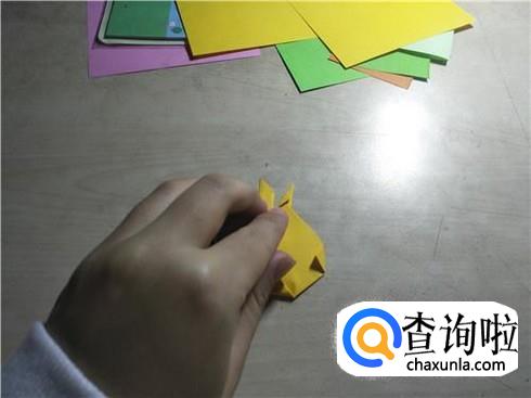 然后就是折叠皮卡丘的耳朵部分了,在那一个部分将它的一边闲着最左边的那一条直线进行对折,对折成功之后就是一个尖尖的图形,另外一边也同样这样做,最后皮卡丘的耳朵就折叠好了。
