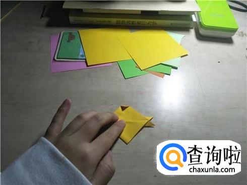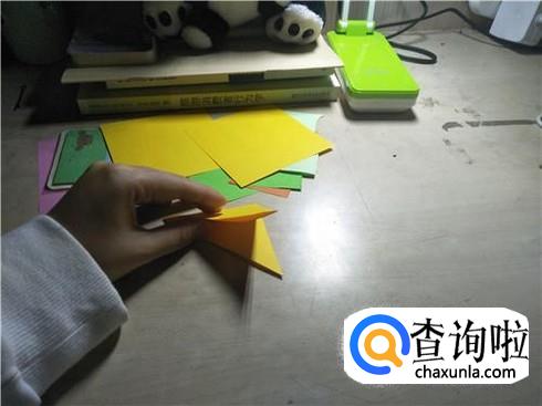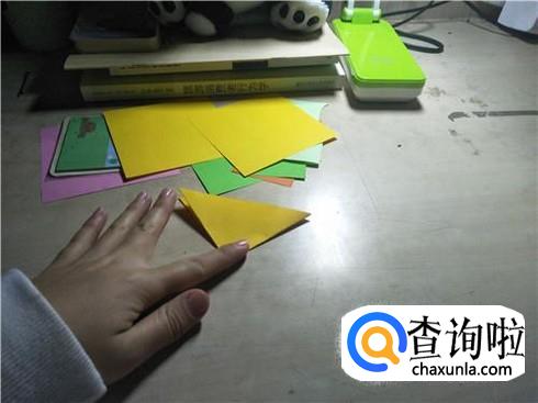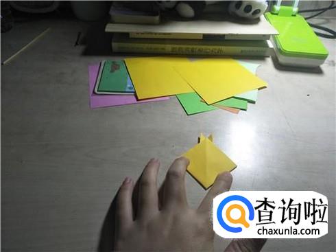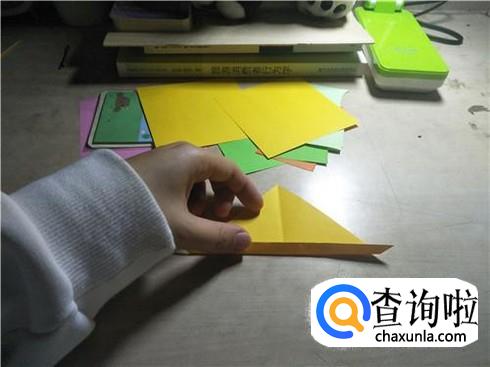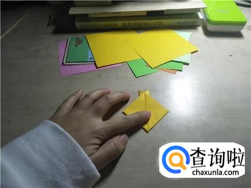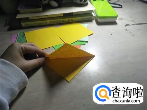 首先将一张正方形纸片沿着它的对角线进行对折,对折之后不要着急打开,让它整理一下即可。