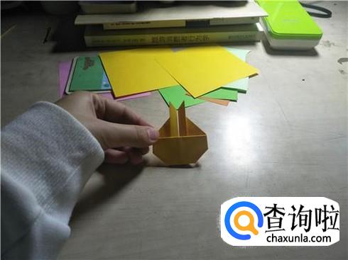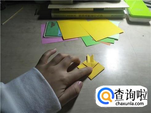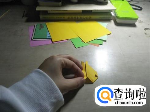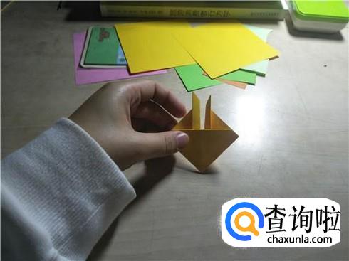 然后再将这个三角形将它嵌入进里面,进入里面之后,再将这个图形左边和右边这两边的那个小三角形将它翻折进去,然后再将最下面的那一个三角尖部分也将它翻着进去,最后会形成一个如图所示的图形。