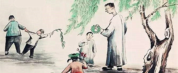 在中国民间,柳枝向来被视为驱除瘟疫的象征,据说这一说法源于佛教,佛教经典《灌顶经》所载,禅拉比丘曾以柳枝咒龙,观音则一手托净瓶,一手拿柳枝,以柳枝沾净瓶中的水向人间抛洒甘露,驱病消灾。受此影响,中国人便以柳为驱邪消灾的吉祥物,称其为“鬼怖木”。清明,古人以为是百鬼出没讨索之时,因此又称鬼节,而清明又正值柳条发芽时节,人们自然纷纷插柳以辟邪了。