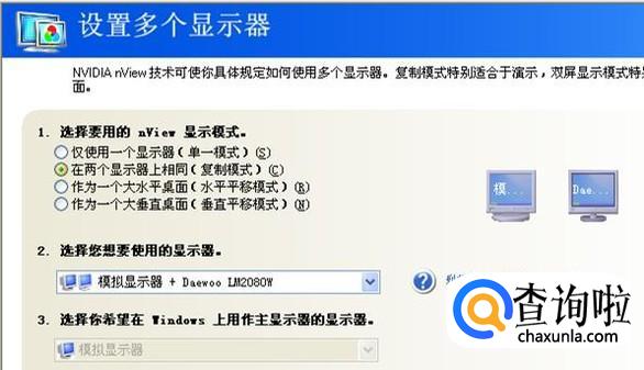 我们选择“在两个显示器上相同”,就会看到旁边出现了两个显示器图片,下面的“选择您想要使用的显示器”也显示出两个显示器。