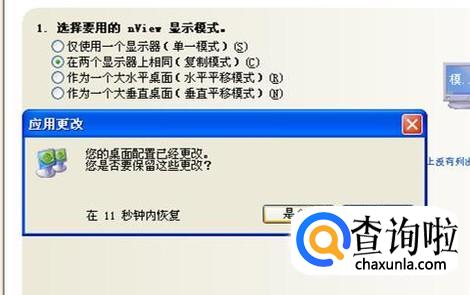 点击界面下方的“应用”后,马上就会看到另一个显示器也显示出一样的内容。这是会弹出一个询问对话框,点“是”,就可以了。