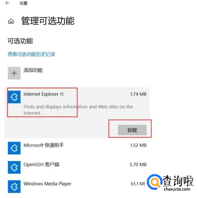 在可选功能页面中,可以看到当前已经安装了IE浏览器软件,点击“卸载”按钮,即可执行IE浏览器的卸载操作。