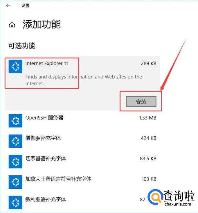 接下来,在功能页面中,找到IE浏览器,点击“安装”按钮即可执行IE浏览器的安装。