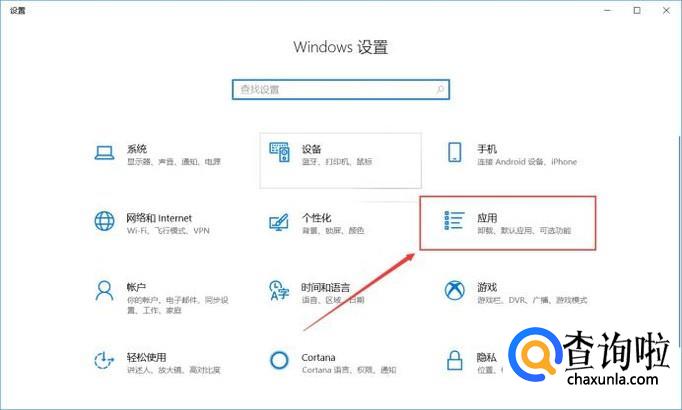 打开Win10系统设置页面之后,点击应用菜单选项。
