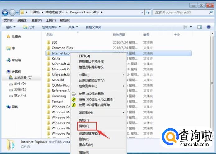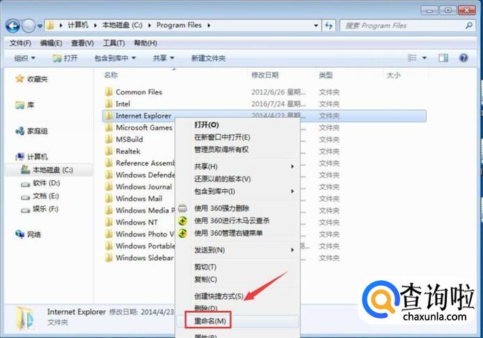 鼠标右键单击Internet Explorer,选择重命名,随意设置一个新的文件夹名字。
