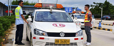 当雨刮器的最高点,或者是左侧雨刮器凸起点与右侧边线重合时,我们就可以微调方向牵直车身。不过并不是每一个人看这个位置都会准确,因为受身高因素影响,很有可能是雨刮器的其他位置,所以我们在训练时一定要自己仔细找到最合适自己的参考点。