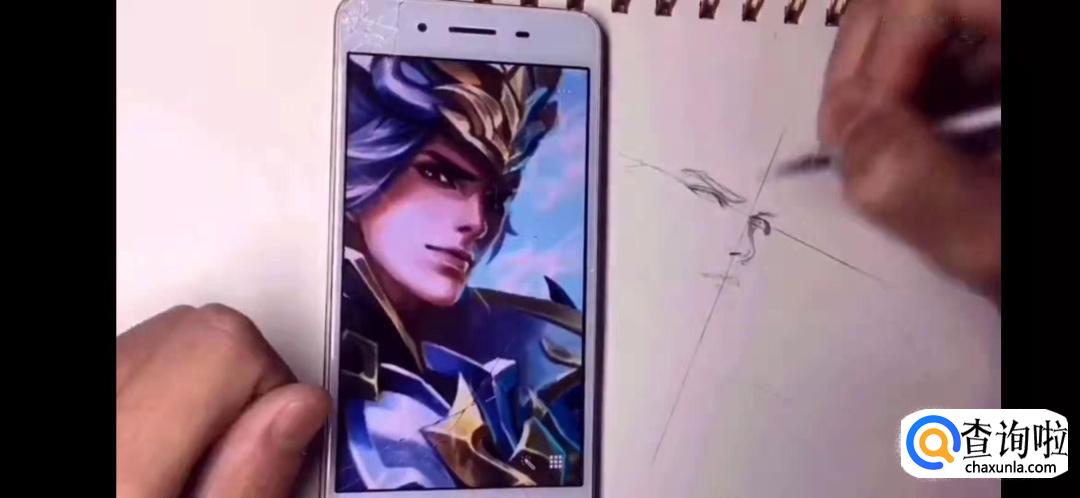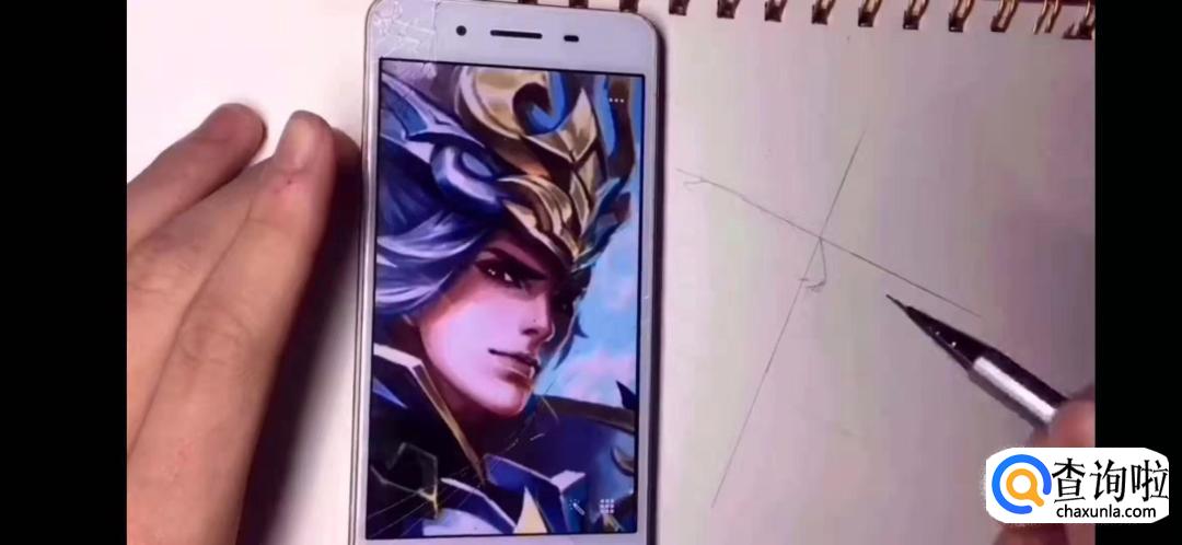 在纸张上面先画出十字,这样好方便描绘王者荣耀韩信脸部的轮廓。