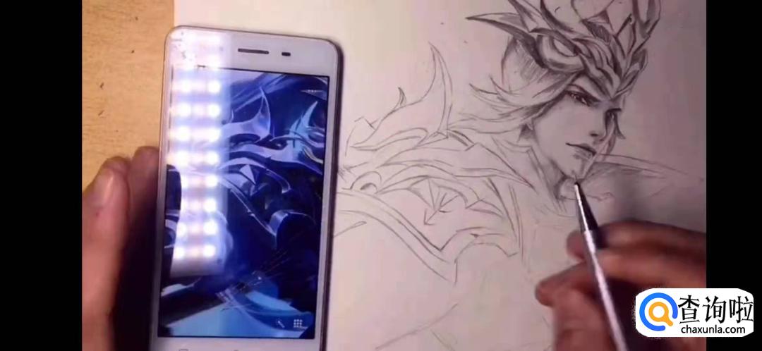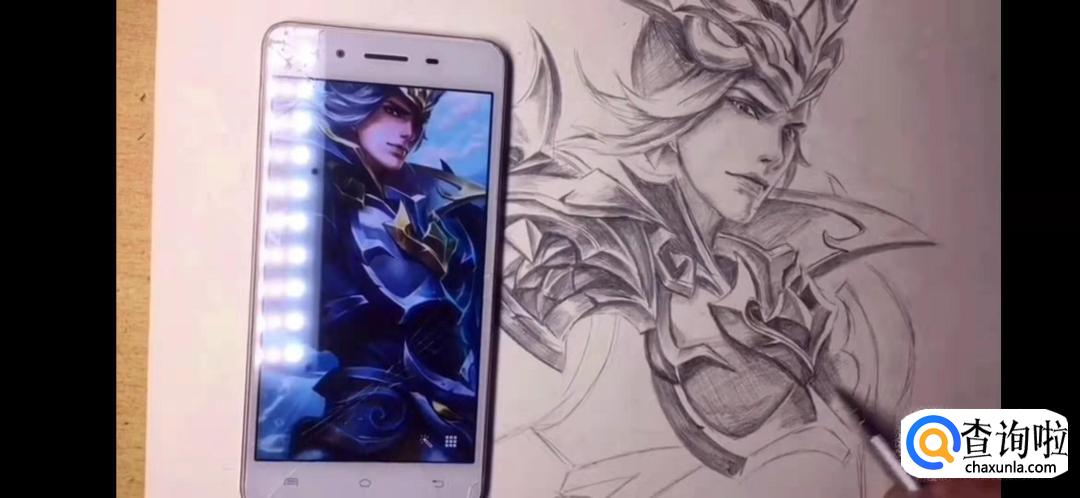 我们在手机里面登录王者荣耀,找到韩信这款人物,显示出来好方便对应画图。