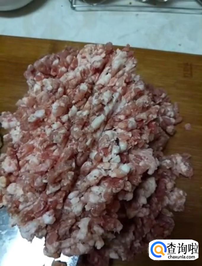 接着我们将猪肉剁成肉泥,放入一个盆中,加入适量剁好的鸡脯肉