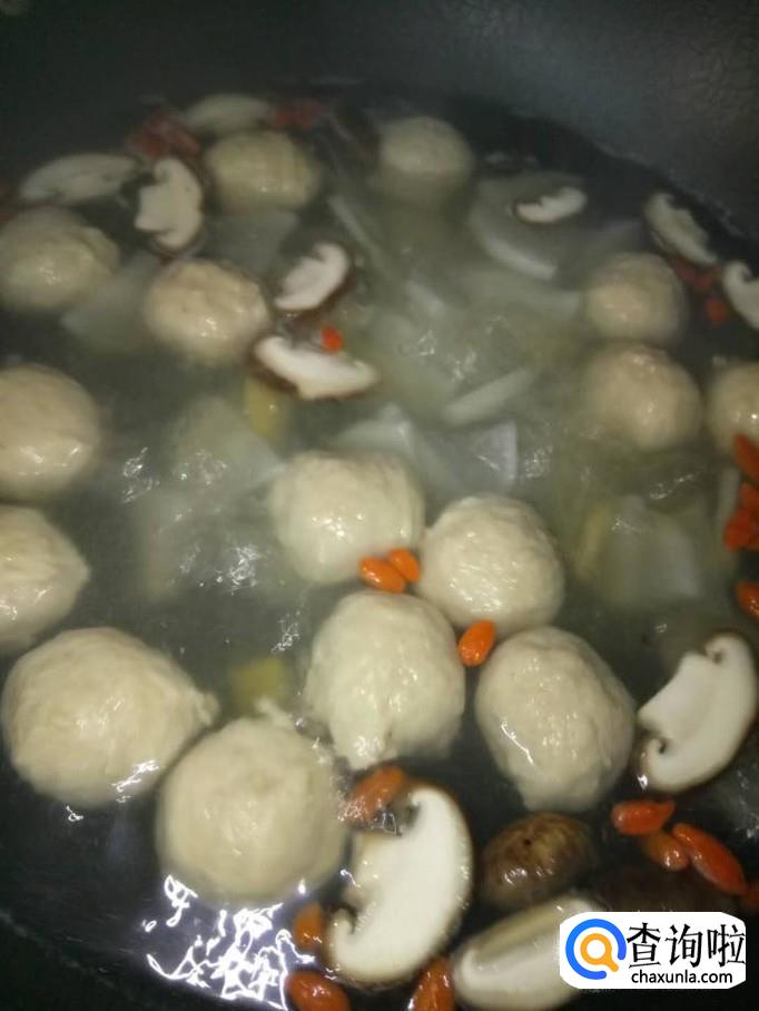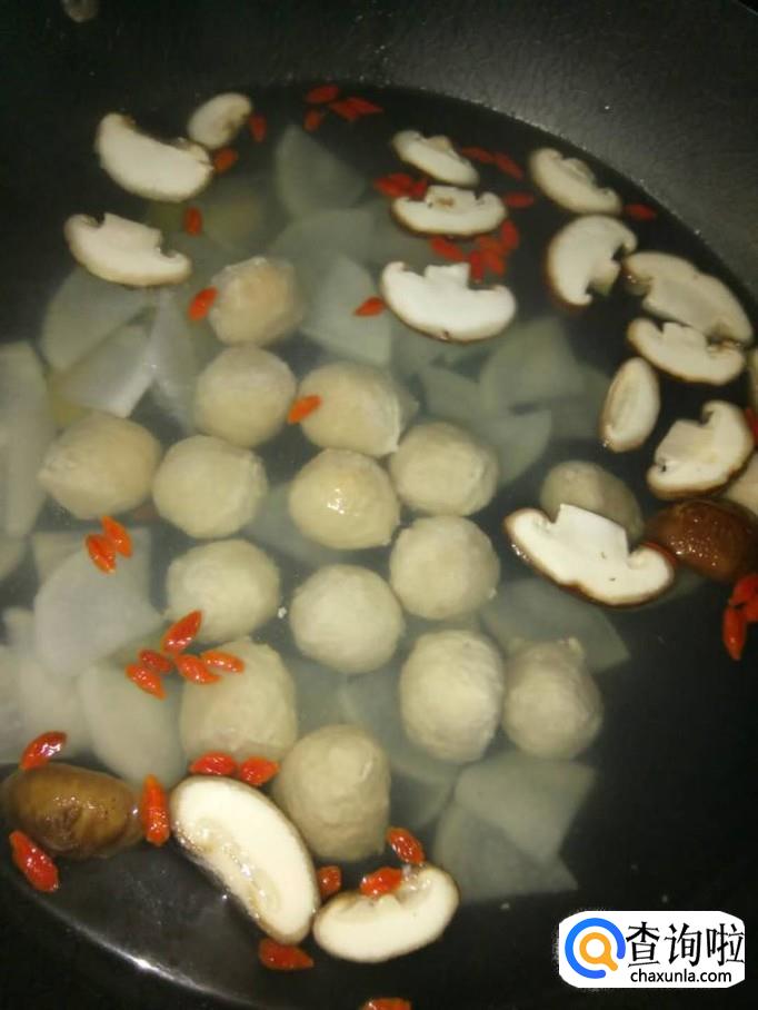 将香菇、枸杞也放入锅里,一起煮;煮到开了后,将鱼丸下入锅里,一起煮;