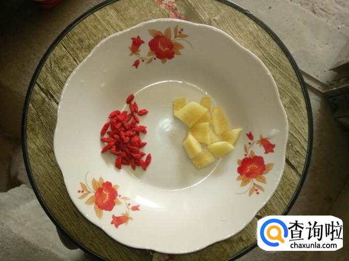 取一小块姜,将姜去皮,洗净,切成片状;取一把枸杞,洗净备用;枸杞可以明目,也能使汤口感更好;