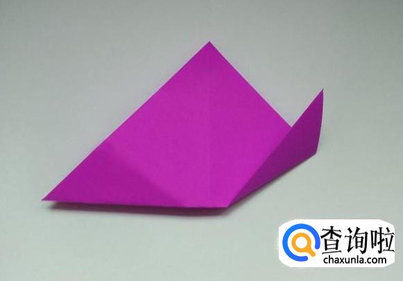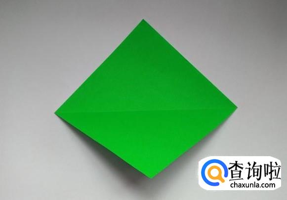 将绿色正方形纸沿对角线对折后打开,然后把左侧上下两面折向对角线。
