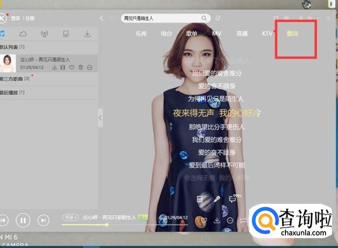 搜索完后,点击播放,在搜索栏下边一栏,在最右边找到歌词两个字。