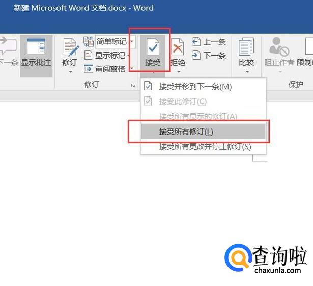 接下来,在打开的审阅页面中,找到“接收”按钮,然后在下拉列表中,点击“接受所有修订”按钮。