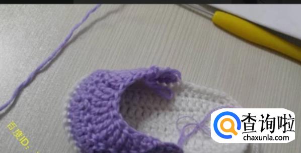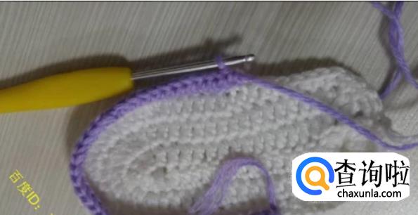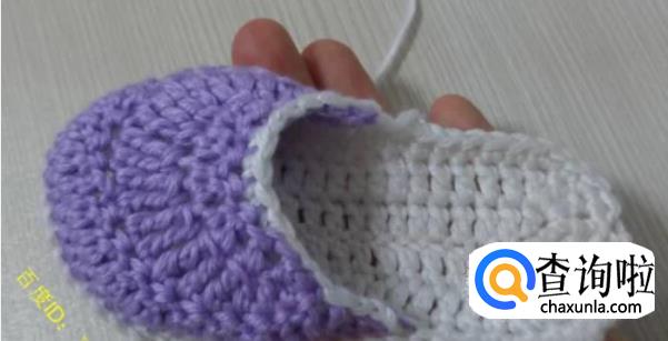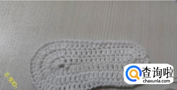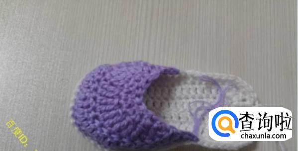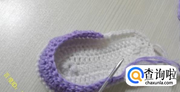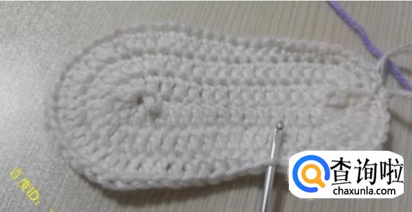 第一圈:将鞋底对折一下,从鞋头部分开始往2个侧边各数19针,然后钩针伸进去,钩离自己远的半针,钩织-圈的中长针,这就是鞋面的第一圈。