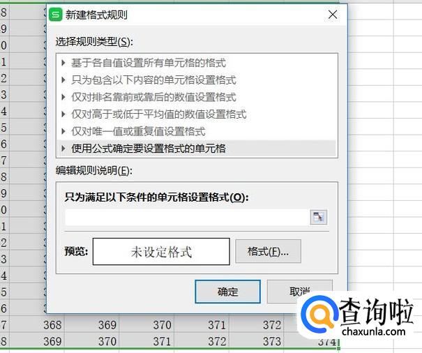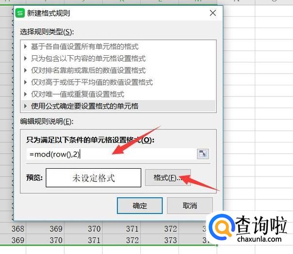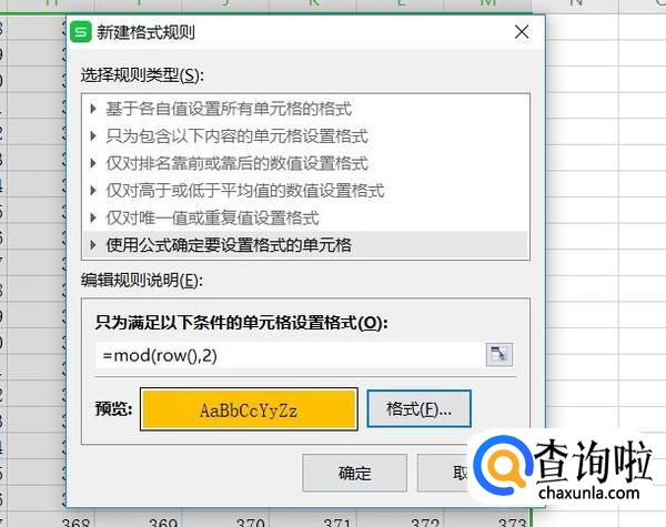 在规则说明的空白处输入=mod(row(),2),并点击格式
