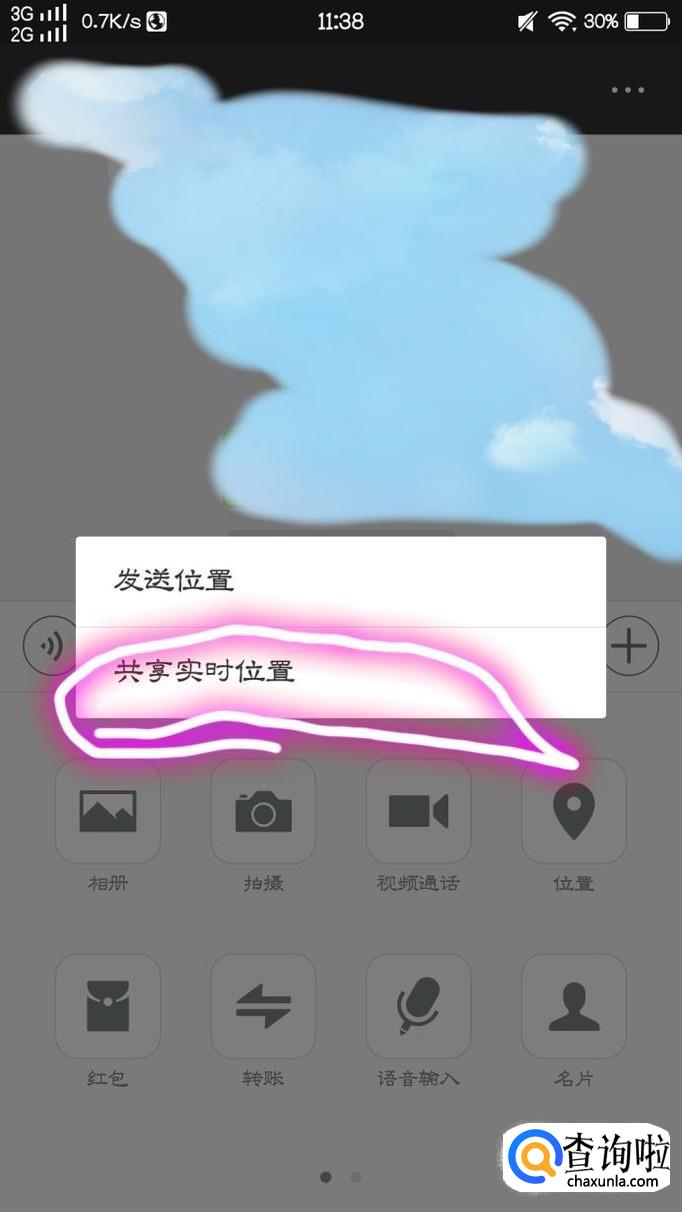 紧接着,我们会看到“共享位置”,我们点击进入便会出现共享实时位置和发送位置,我们点击“共享实时位置”