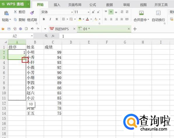 在名次那一列的前两行分别填1、2,然后鼠标放在右下角,变成一个“+”号,往下拉至最后一名。