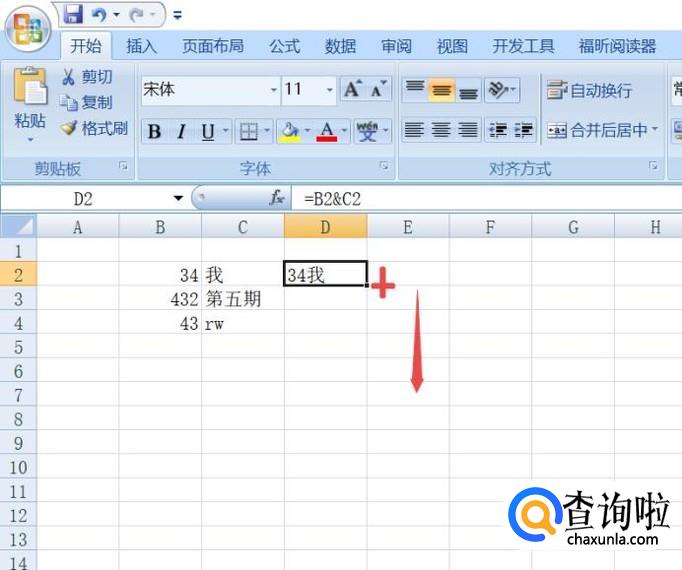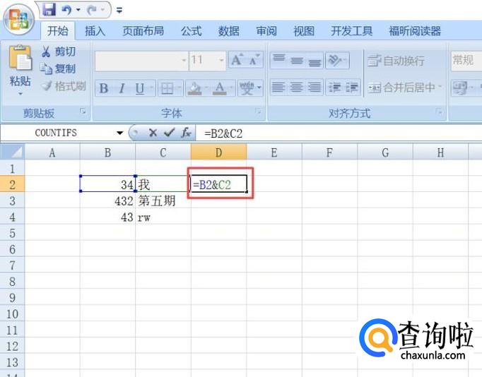 之后我们选中图示中的单元格,然后我们输入=B2&C2,之后按回车键;