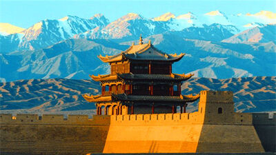嘉峪关,雄据万里长城西端终点,峭立嘉峪山之麓。巍峨宏伟,险峻天成,气势磅礴,“连陲锁钥”,是古代万里长城防线上的重要军事 要塞、河西第一隘口,也是古代“丝绸之路”上的必经关隘。 “第一雄关”城楼,重建于1372年(明洪武年间),呈正方型,开东西二门,城头四角各有一座“角楼”,南北城墙中段各有一座“敌楼”。壁垒森严,雄伟坚固。