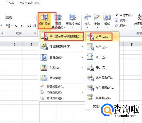 之后我们点击条件格式,然后弹出的界面,我们点击突出显示单元格规则,然后我们点击大于这个条件;