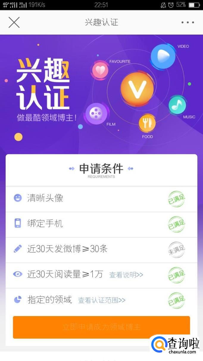 兴趣认证,在微博某一个领域贡献内容的用户,要有清晰的头像,绑定手机号,30内发微博大于30条等条件可以申请。