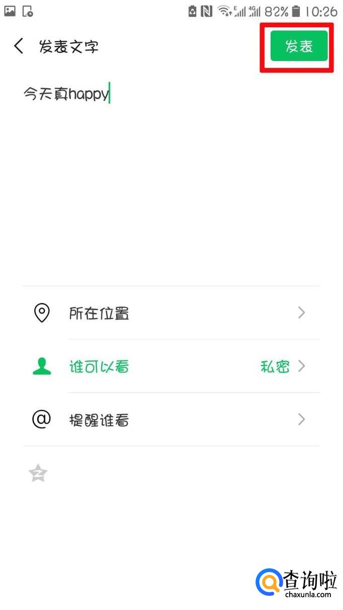 来到发表文字页面,我们输入想要发送的文字,再点击右上角的【发表】即可。