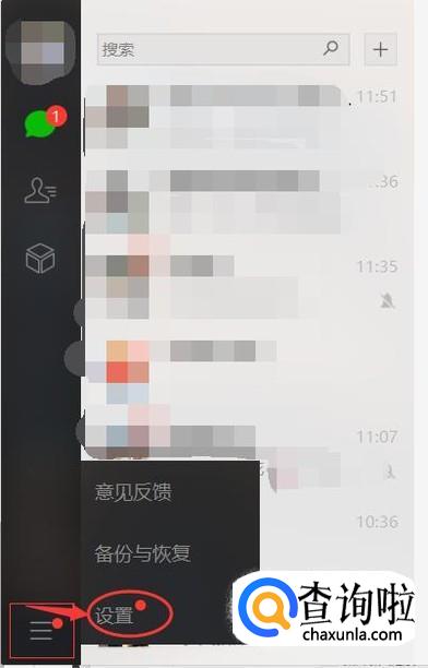 首先在电脑端登录微信,如图点击微信界面左下角的菜单图标(”三“),在弹出界面右侧点击“设置”