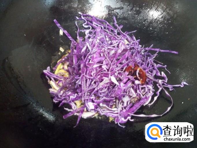炒至肉颜色微白,放入葱,姜,蒜翻炒,放入少许酱油。随即放入紫甘蓝翻炒,放入少许蚝油。
