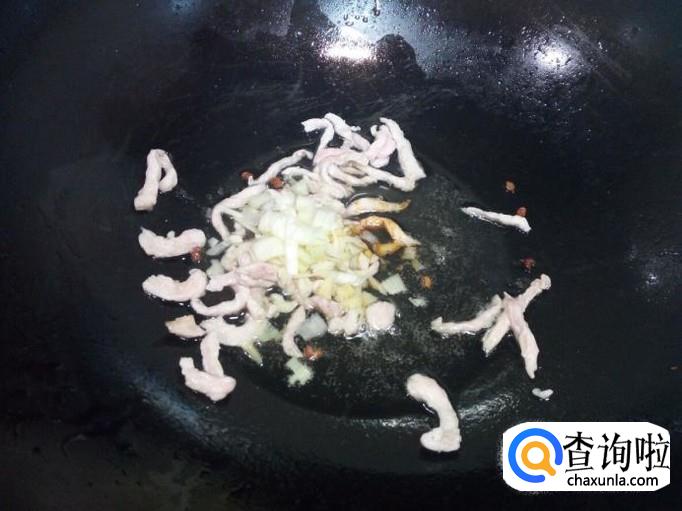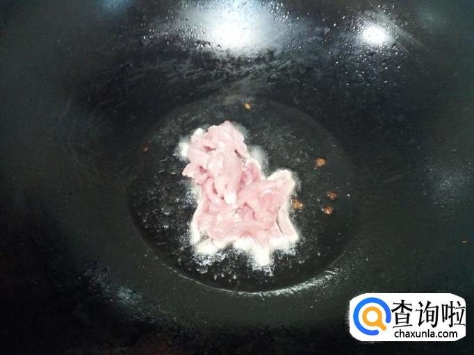 锅里放入油加热,油热后放入花椒爆锅,放入肉翻炒。