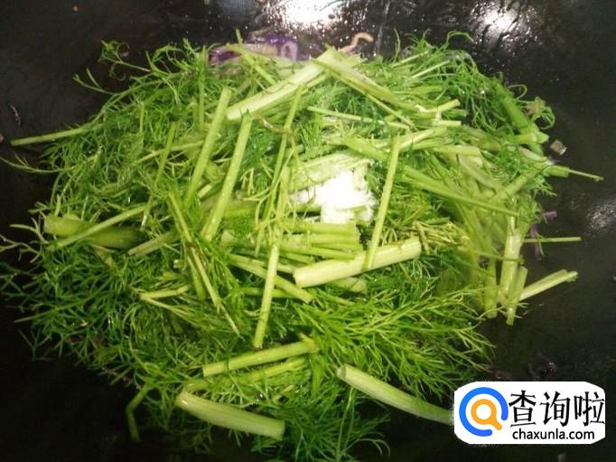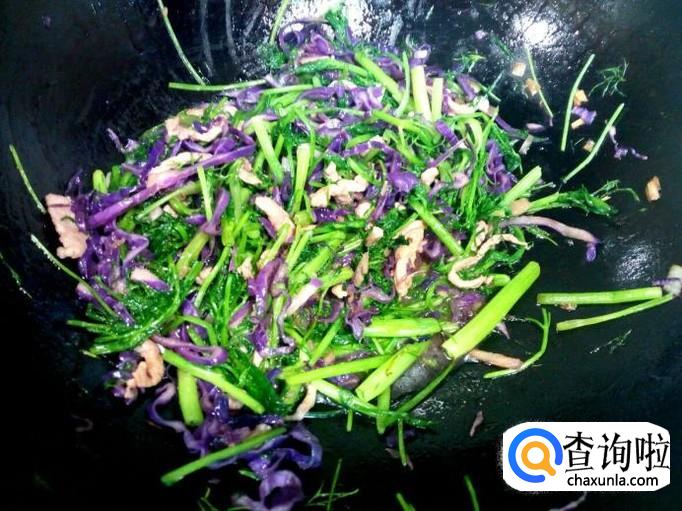 炒至紫甘蓝变软,放入茴香翻炒,放入盐。炒至茴香断生,放入味精,关火出勺。