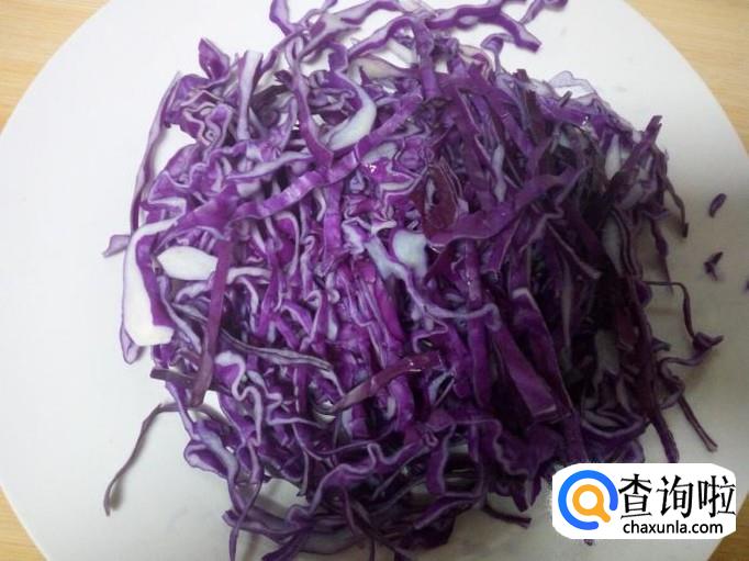 紫甘蓝用水清洗干净,控干水分,切成丝。