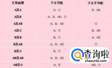 母双亲血型O+B 子女血型可能有B、O ,子女血型不可能有A、AB