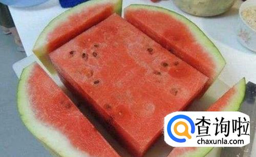 将西瓜切成两边,再沿着西瓜周围切出四个圆块,剩下的就是一个没有皮的长方形西瓜,一整个方形西瓜可以直接用来使用。剩下的四个圆块西瓜却不能食用,因为”肉少皮厚”,一般会将其扔掉。