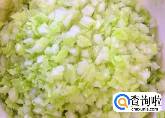把白菜切成小块,然后撒入一些盐。之后剁成白菜馅就可以了。剁完后挤掉多余的水分。