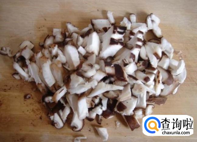 干香菇泡发后,摘取蒂,然后切成细小的香菇粒。如果是鲜香菇,直接洗净切粒即可。