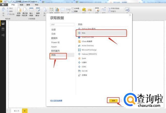 在获取数据界面“其他”页面,选择“Web”方式,点击下方的“连接”按钮,便可选中使用网页URL方式连接至web网页数据源。
