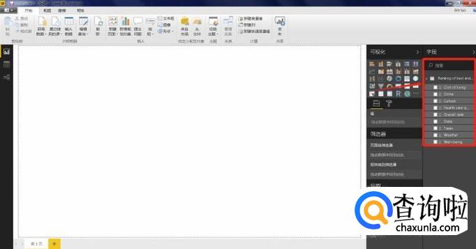 如图,便是加载完毕后再Power BI中的显示界面,你可通过操作右侧字段完成你所需要做的工作,在白板上展示需要展示的数据。