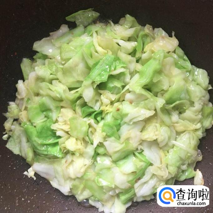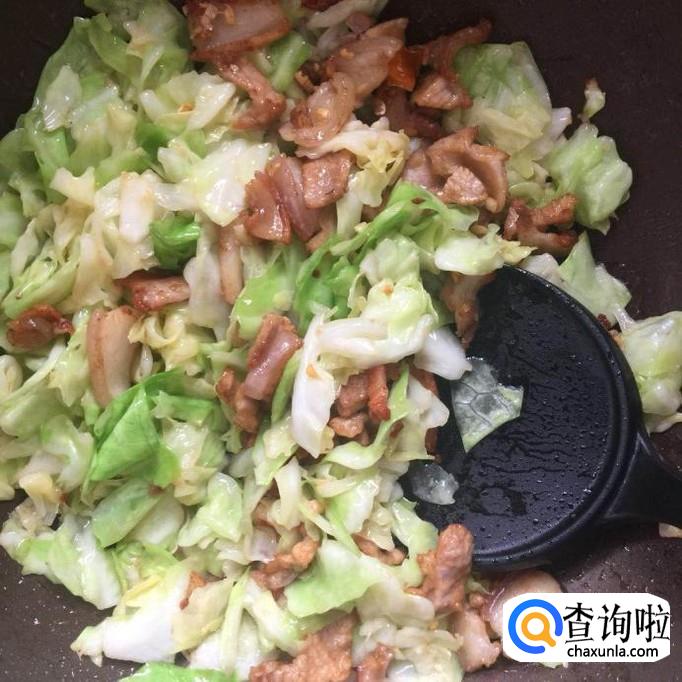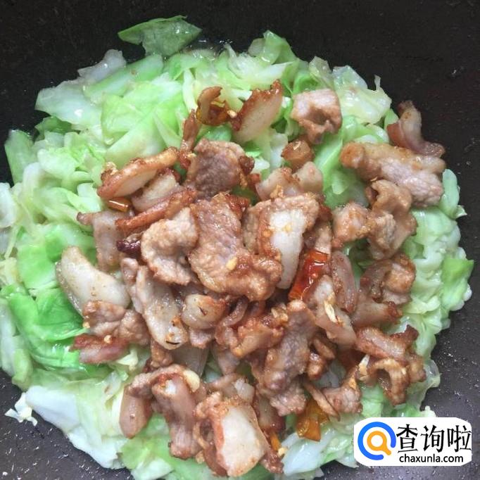 接着把炒好的腿肉倒入锅中和包菜一起翻炒三分钟,如下图所示。