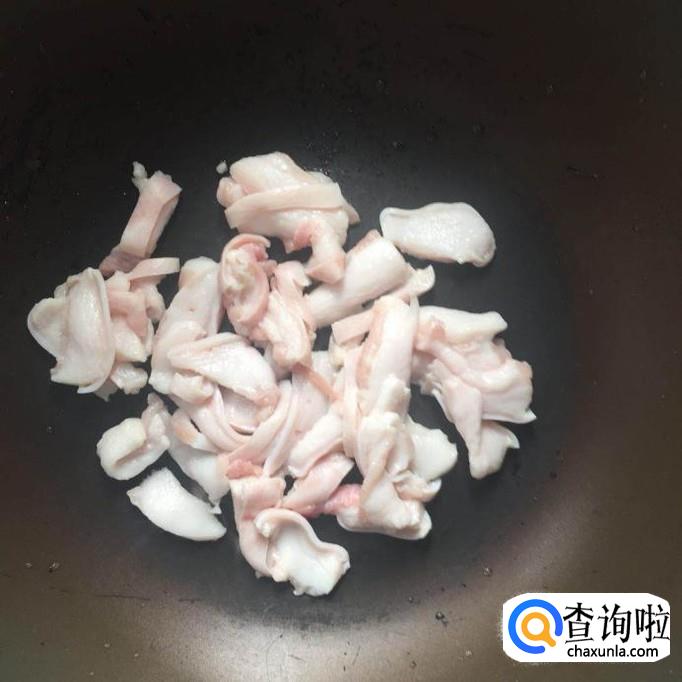 然后把腿肉中的肥肉切成薄片,倒入油锅炸油,如下图所示。大家在炸油的过程中,应该尽可能开小火,这样炸出来的油渣才好吃。