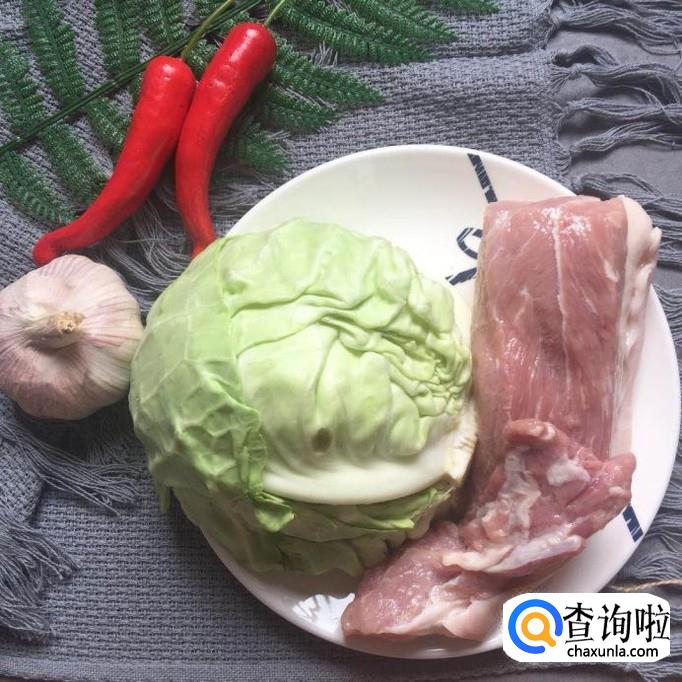 包菜,腿肉,蒜头,辣椒,地瓜粉,酱油,盐巴,味精。