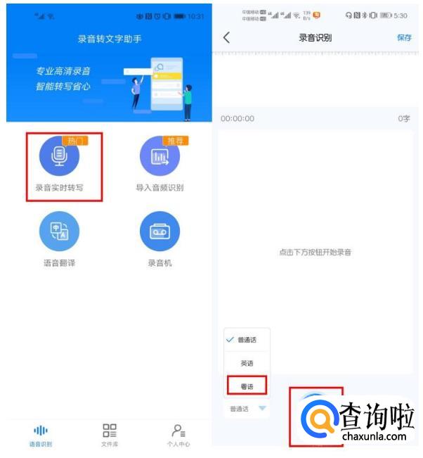 首先在手机应用市场找到【录音转文字助手】,并装好在手机桌面上,进入工具后,我们直接点击录音实时转写功能,跳转到新页面后,先设置一下需要识别的语言:普通话、粤语、英语,这是我们设置识别粤语。