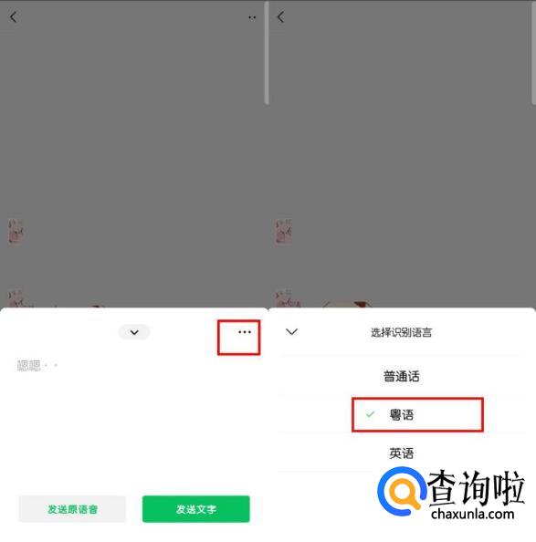 接着将语音滑到转文字按钮上,就会跳转到识别界面,点击右上角的三个点,在里面选择粤语按钮,这样说出来的粤语就会被转为文字显示出来啦,最后直接发送出去就行了。