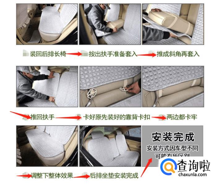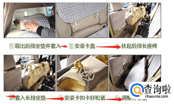 汽车坐垫长座和后靠分开后,你将长垫通过汽车坐垫上的卡口从下面穿过并固定好长车垫了。这时你也可以将后靠背套入后靠座椅的帽头上了。完整步骤如图所示。