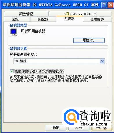 还可以在上图中点击“高级”按钮,在显示器设置里看看刷新率是否正常,一般液晶显示器刷新率都是60HZ,,如果不对的话就调过来。