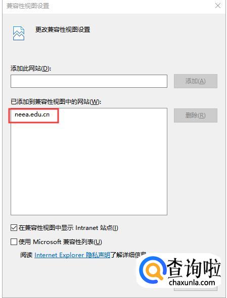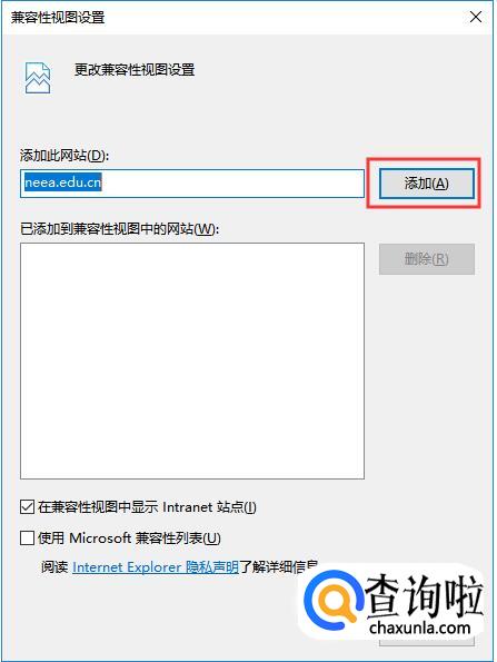 调出兼容性视图窗口后,会自动识别网址,只需要点击添加就可以了。添加成功后点击关闭。